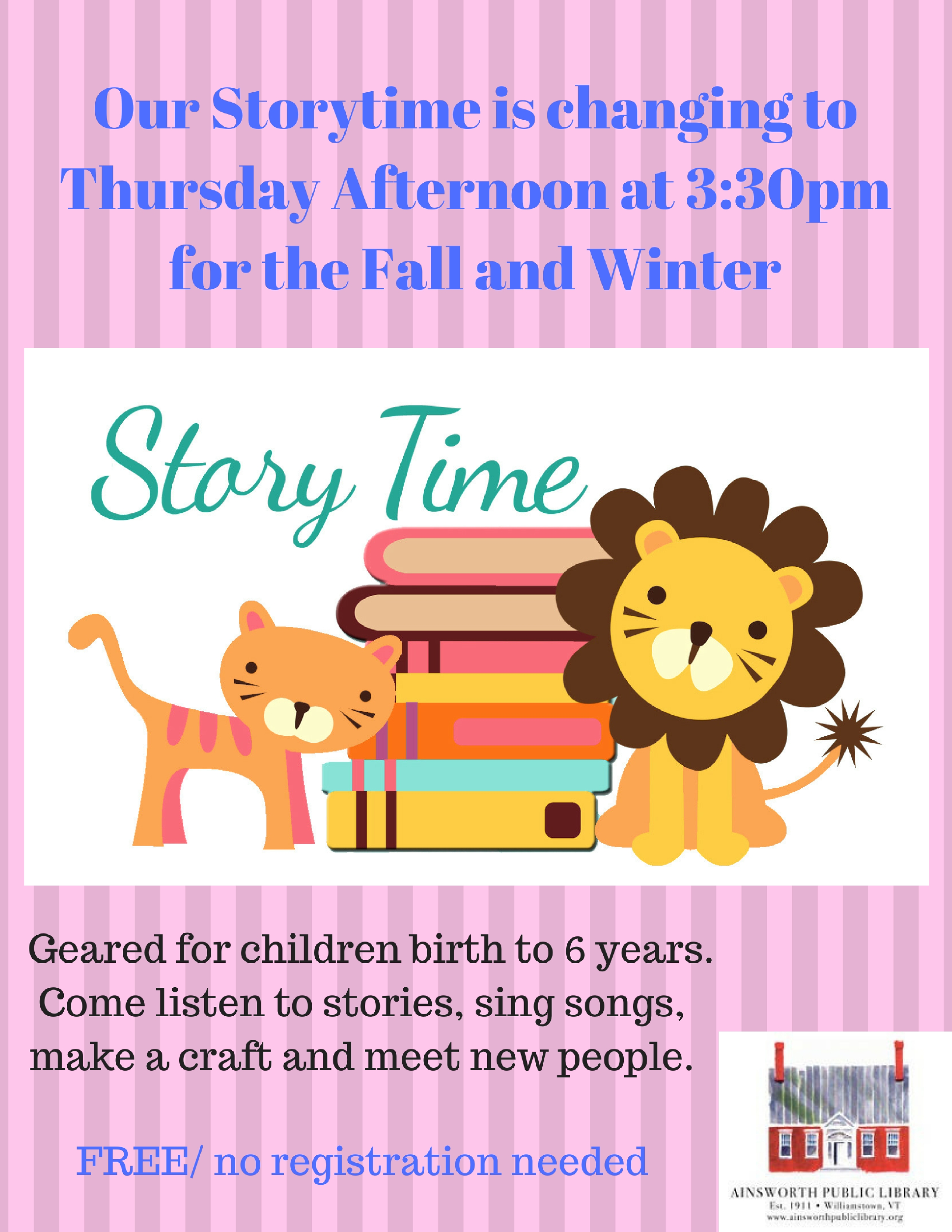 Our Storytime is changing to Thursday Afternoon 3_30pm for the Fall and Winter